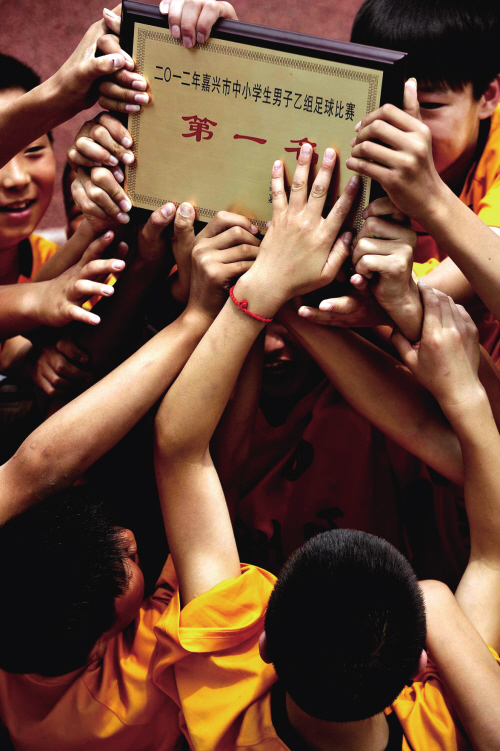 昨天,2012年嘉興市中小學(xué)生足球(乙組)比賽在嘉職院舉行,由王店鎮(zhèn)中心小學(xué)足球運動員組成的秀洲區(qū)代表隊獲得了男子組第一名。在比賽結(jié)束頒獎時,這些在場上奮力拼搏的足球娃娃爭搶獎牌。