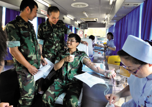 昨天中午,嘉興市中心血站流動(dòng)獻(xiàn)血車開進(jìn)了嘉興職業(yè)技術(shù)學(xué)院,正在參加軍訓(xùn)的大一新生們紛紛從訓(xùn)練場(chǎng)地直接走上獻(xiàn)血車,獻(xiàn)上自己的一份愛心。N記者 李劍銘 攝