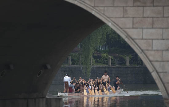 昨天,市區(qū)紫陽橋下,龍舟鑼鼓聲由遠及近,龍舟隊員們頂著烈日,沖刺端午。
