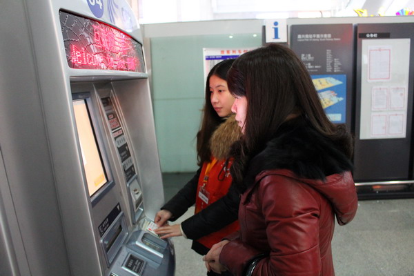 春運(yùn)期間,嘉興職業(yè)技術(shù)學(xué)院組織近三百名大學(xué)生志愿者,在嘉興站和嘉興南站參與春運(yùn)一線服務(wù)工作,為出行的旅客提供便利。圖為該校大學(xué)生志愿者幫助旅客在自助售票機(jī)上購票。(本報(bào)通訊員 趙遠(yuǎn)遠(yuǎn) 攝)