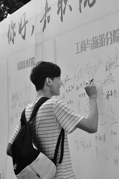 ?▲9月18日,嘉興職業(yè)技術(shù)學(xué)院新生入學(xué)第一天,新生報到后在簽名墻上鄭重地寫下自己的名字,成為新的嘉職院人,這樣的形式,讓初來乍到的學(xué)生立即找到了滿滿的歸屬感。