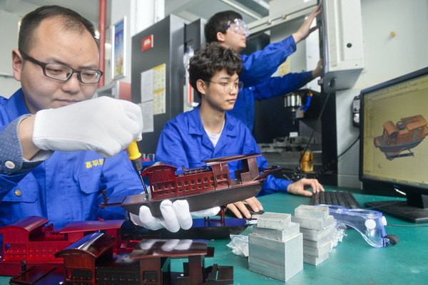 日前,嘉興職業(yè)技術學院的師生根據(jù)南湖紅船尺寸制作三維模型,利用數(shù)控技術將鋁合金毛坯料“雕琢”成船身零部件,經(jīng)表面加工后最終完成紅船模型作品。圖為師生共同制作鋁合金紅船模型。(本報通訊員    王振宇  攝)