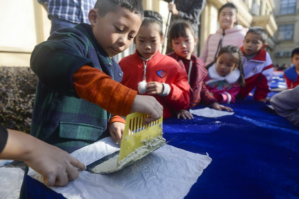 11月24日,全省非遺傳承人群研習(xí)培訓(xùn)——織繡印染(藍(lán)印花布)方向結(jié)業(yè)作品在市區(qū)重水美術(shù)館展覽,市民親子團(tuán)也來(lái)到現(xiàn)場(chǎng),孩子們動(dòng)手制作藍(lán)印花布,體驗(yàn)藍(lán)染技藝,感受非遺的魅力。