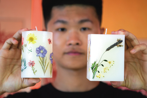 昨天,嘉興職業(yè)技術(shù)學院校園“愛生節(jié)”上,農(nóng)建學院園林專業(yè)的學生展示自己制作的“貼花”蠟燭,普通的蠟燭外表貼上了自己制作的干花,變成了藝術(shù)品。