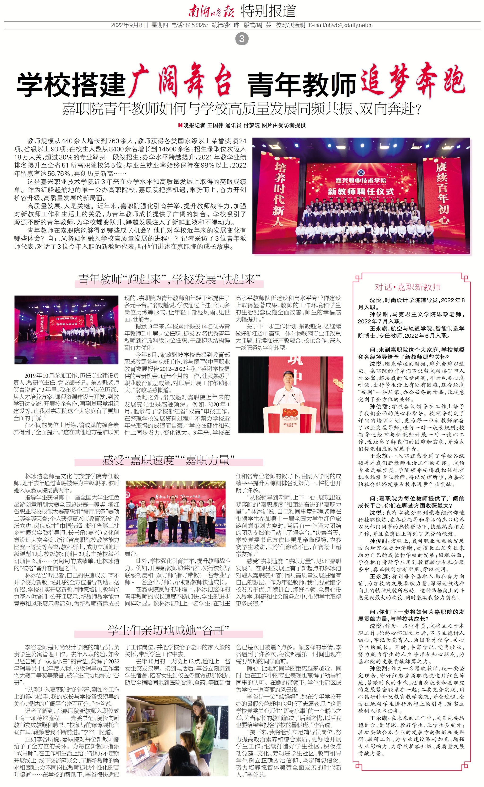 青年教師在嘉職院能夠得到哪些成長機(jī)會?他們對學(xué)校近年來的發(fā)展變化有哪些體會?自己又將如何融入學(xué)校高質(zhì)量發(fā)展的進(jìn)程中?記者采訪了3位青年教師代表,對話了3位今年入職的新教師代表,聽他們講述在嘉職院的成長故事。