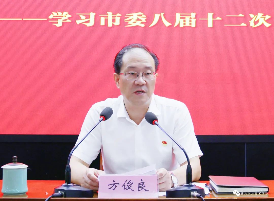 方俊良指出,要提高站位、深化認(rèn)識,準(zhǔn)確把握市委八屆十二次全會的精神要義。市委八屆十二次全會是在全市上下深入貫徹習(xí)近平總書記在慶祝中國共產(chǎn)黨成立100周年大會上的重要講話精神,全面開啟第二個百年奮斗目標(biāo)新征程召開的一次具有特殊意義的重要會議。市委張兵書記在全會上所作的工作報(bào)告,高舉習(xí)近平新時代中國特色社會主義思想偉大旗幟,通篇體現(xiàn)以人民為中心的理念,站位高、立意新、謀劃遠(yuǎn)、思考深、舉措實(shí)。全校上下要把學(xué)習(xí)貫徹此次全會精神作為當(dāng)前及今后一個時期的重要任務(wù),全面興起學(xué)習(xí)貫徹全會精神的熱潮,要在學(xué)習(xí)過程中深刻領(lǐng)會推進(jìn)高質(zhì)量發(fā)展建設(shè)共同富裕典范城市的重大意義、深邃內(nèi)涵、戰(zhàn)略布局;要提高站位、統(tǒng)一共識,把牢方向、校準(zhǔn)坐標(biāo),明確目標(biāo)、強(qiáng)化落實(shí),發(fā)揮好職業(yè)高等教育的優(yōu)勢和功能,為我市高質(zhì)量發(fā)展建設(shè)共同富裕典范城市提供充足的技能人才供給和技術(shù)支持。