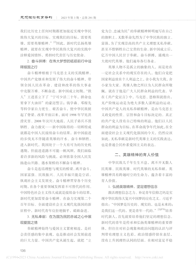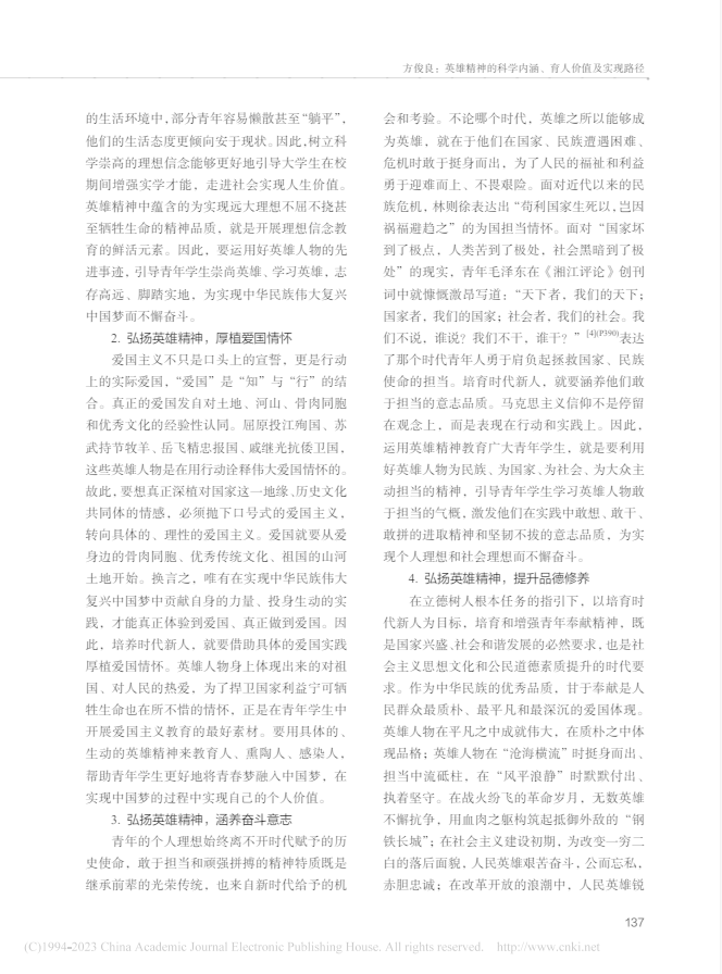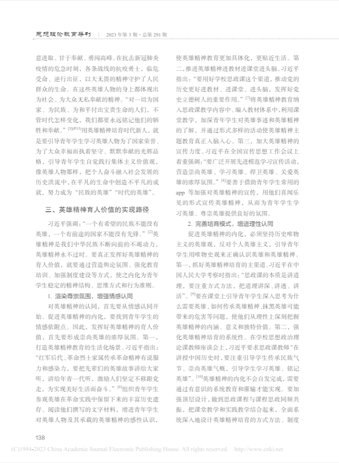 英雄精神是我們中華民族不斷向前的不竭動(dòng)力,英雄精神永不過(guò)時(shí)。要真正發(fā)揮好英雄精神的育人價(jià)值,就要通過(guò)營(yíng)造輿論氛圍、強(qiáng)化教育培訓(xùn)、加強(qiáng)制度建設(shè)等方式,使之內(nèi)化為青年學(xué)生穩(wěn)定的精神結(jié)構(gòu)、思維方式和行為準(zhǔn)則。