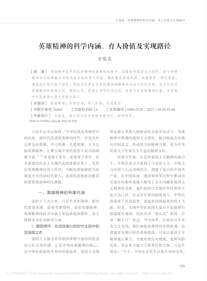 近日,全國(guó)中文核心期刊、CSSCI來(lái)源期刊《思想理論教育導(dǎo)刊》2023年第3期刊登嘉職院黨委書(shū)記方俊良論文《英雄精神的科學(xué)內(nèi)涵、育人價(jià)值及實(shí)現(xiàn)路徑》。