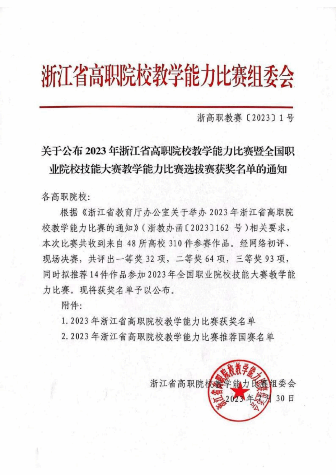 據(jù)悉,浙江省高職院校教學(xué)能力比賽是代表省內(nèi)高職院校教學(xué)能力最高水平的權(quán)威賽事,本屆比賽共有48所高職院校參賽,在各高職院校選送的310件作品中,經(jīng)網(wǎng)絡(luò)初審和現(xiàn)場(chǎng)決賽,評(píng)選出一等獎(jiǎng)32項(xiàng)、二等獎(jiǎng)64項(xiàng)、三等獎(jiǎng)93項(xiàng),并推薦14項(xiàng)優(yōu)秀作品代表浙江省參加2023年全國(guó)職業(yè)院校教學(xué)能力比賽。