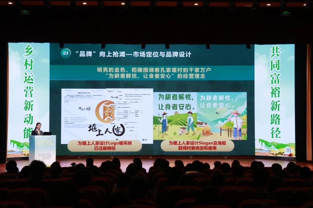 文化與旅游學(xué)院學(xué)生李佺嫄以《甄心不負大地 品質(zhì)不負生活——里溝村蔬果品牌方案設(shè)計》為主題做項目推介,介紹了文創(chuàng)專業(yè)學(xué)生團隊利用專業(yè)知識為里溝村進行品牌形象設(shè)計及營銷推廣,為美麗鄉(xiāng)村建設(shè)貢獻力量的故事。