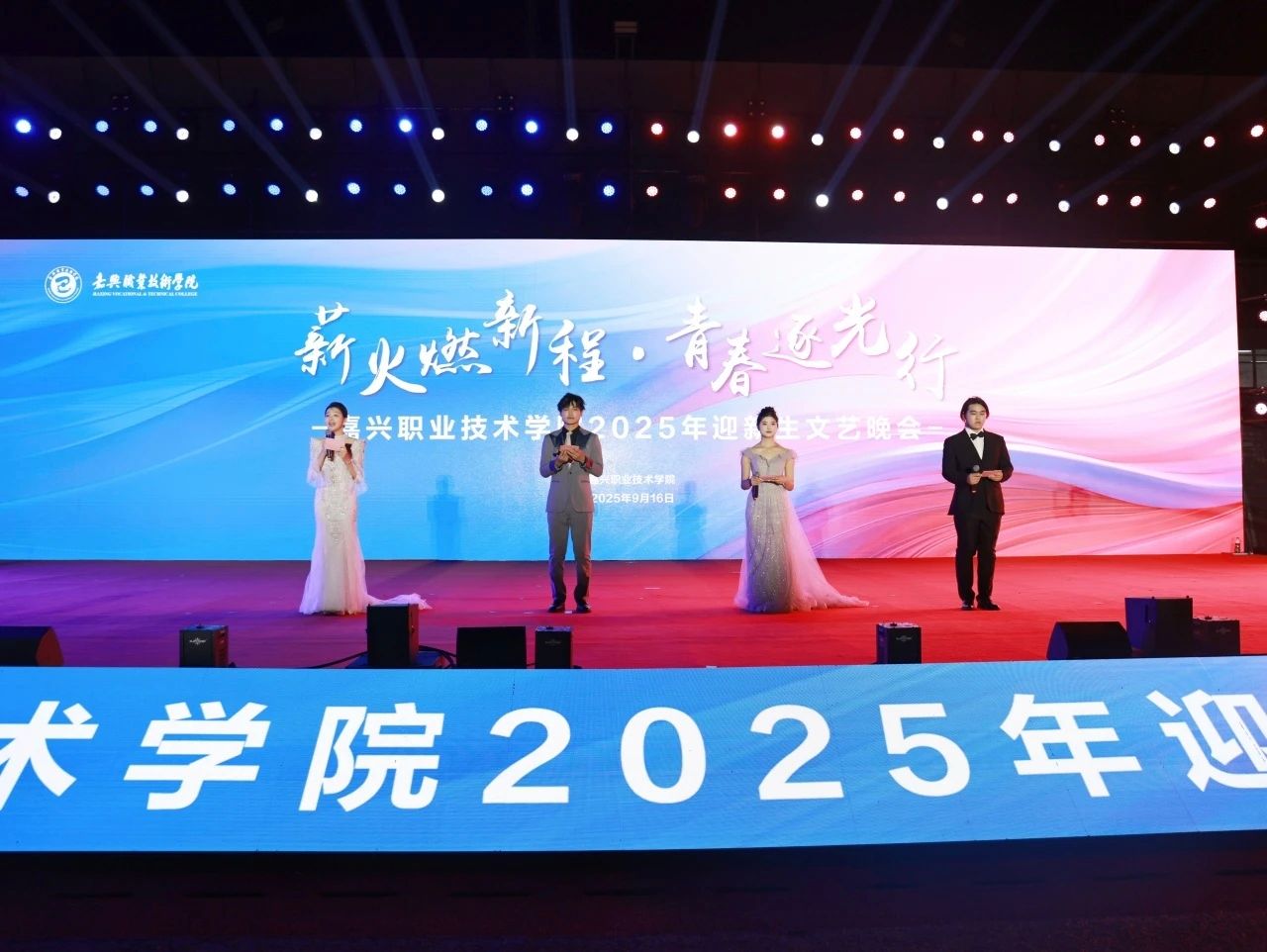 9月16日晚,嘉興職業(yè)技術(shù)學(xué)院2025級新生開學(xué)典禮、軍訓(xùn)動員大會暨迎新晚會在學(xué)校操場隆重舉行。黨委書記朱學(xué)軍、院長張紅等校領(lǐng)導(dǎo)班子成員出席,黨委副書記、副院長程旺大主持。