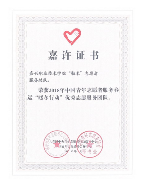 日前,團(tuán)中央青年志愿者行動(dòng)指導(dǎo)中心、中國(guó)青年志愿者協(xié)會(huì)公布了中國(guó)青年志愿者服務(wù)春運(yùn)“暖冬行動(dòng)”評(píng)選結(jié)果,對(duì)全國(guó)100個(gè)優(yōu)秀志愿服務(wù)團(tuán)隊(duì)進(jìn)行了表彰,我院團(tuán)委“勤禾”志愿者服務(wù)總隊(duì)在2018年中國(guó)青年志愿者服務(wù)春運(yùn)“暖冬行動(dòng)”中,榮獲 “優(yōu)秀志愿服務(wù)團(tuán)隊(duì)”稱(chēng)號(hào)。