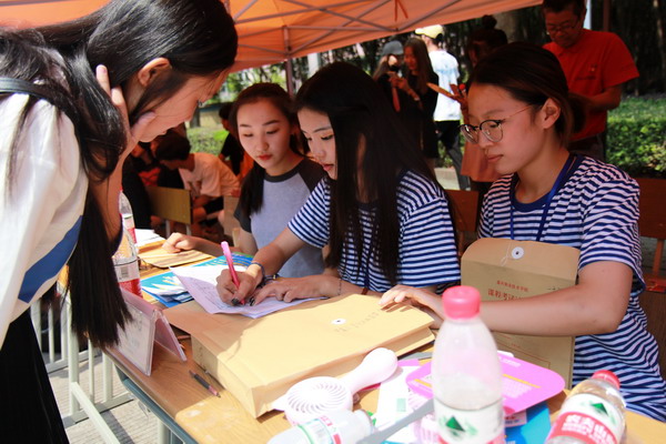 紡織與藝術(shù)設(shè)計(jì)學(xué)院報(bào)到處,身著?;晟赖膶W(xué)生志愿者認(rèn)真地幫助老師做好新生報(bào)到工作。