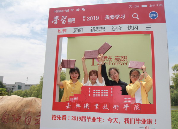 旅游管理專業(yè)162班的學(xué)子們,手拿畢業(yè)證書,興高采烈地在行政樓前校訓(xùn)石旁的學(xué)習(xí)強(qiáng)國APP模型板里合影留念,記錄自己在嘉職院的最后時(shí)光。(趙遠(yuǎn)遠(yuǎn))