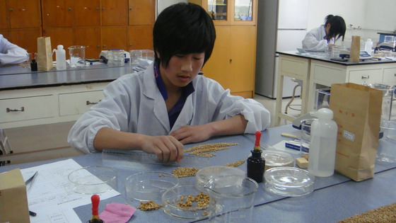 小選手在進(jìn)行種子質(zhì)量檢測項(xiàng)目比賽