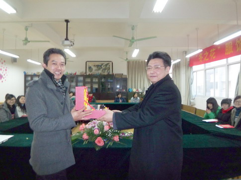 嘉興冬之花針織有限公司陸明衛(wèi)總經(jīng)理向一等獎(jiǎng)獲得者——服裝082陳冬冬同學(xué)頒獎(jiǎng)紡藝分院藍(lán)烈煌書記代表分院向陸總贈(zèng)送校企合作紀(jì)念品