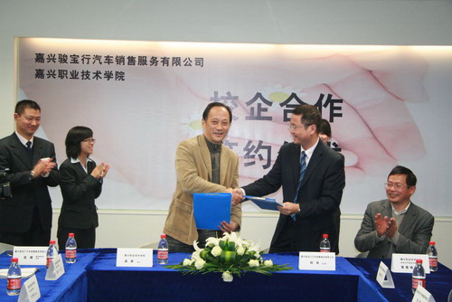 盛健院長(zhǎng)和楊??偨?jīng)理分別代表合作雙方在協(xié)議書(shū)上鄭重簽字。 簽字儀式上,嘉興駿寶行總經(jīng)理?xiàng)詈?,機(jī)電與汽車分院黨總書(shū)記、副院長(zhǎng)童云飛先后致辭。他們高度稱贊此次合作將為企業(yè)構(gòu)建永久“人才庫(kù)”、搭建實(shí)用高效的人才培養(yǎng)平臺(tái),也為在校生與社會(huì)工作崗位零距離接觸提供了真實(shí)可靠的場(chǎng)所。此次合作將大大縮短高校畢業(yè)生從學(xué)校到社會(huì)的過(guò)渡時(shí)間,對(duì)全面掌握對(duì)應(yīng)職業(yè)崗位的基本技能、主流知識(shí)和技術(shù)創(chuàng)造了良好的條件,既有利于為嘉興駿寶行輸送人才,也有利于促進(jìn)嘉興職業(yè)技術(shù)學(xué)院不斷探索創(chuàng)新工學(xué)結(jié)合人才培養(yǎng)模式,更有利于學(xué)生真正意義上的“學(xué)習(xí)型就業(yè)”,實(shí)現(xiàn)學(xué)校、企業(yè)、學(xué)生的共贏。 汽車071班學(xué)生余高峰、現(xiàn)已成為嘉興駿寶行汽車銷售服務(wù)有限公司員工的汽車05級(jí)學(xué)生張建超也在簽字儀式上發(fā)言。他們一致感謝母校和企業(yè)的悉心培養(yǎng),為學(xué)生的成長(zhǎng)成才提供如此優(yōu)越的條件。他們表示將在實(shí)踐中努力學(xué)習(xí),鍛煉成才。 簽字儀式后,盛健院長(zhǎng)和楊??偨?jīng)理來(lái)到維修車間,在熱烈的掌聲和繽紛的禮花中,共同為“嘉興職業(yè)技術(shù)學(xué)院駐嘉興駿寶行校外實(shí)訓(xùn)基地”揭牌。 盛院長(zhǎng)一行在楊總經(jīng)理的陪同下,參觀嘉興駿寶行的展廳和車間,與在此間工作、實(shí)習(xí)的我院校友、學(xué)生親切交談,仔細(xì)了解他們的工作學(xué)習(xí)情況。 根據(jù)協(xié)議,校企雙方將就學(xué)生教育實(shí)習(xí)實(shí)訓(xùn)、技術(shù)與服務(wù)合作及汽車專業(yè)優(yōu)秀大學(xué)生獎(jiǎng)學(xué)金計(jì)劃的實(shí)施進(jìn)行深入合作,戮力同心,為嘉興汽車行業(yè)培養(yǎng)高技能專業(yè)人才。(宣傳部)