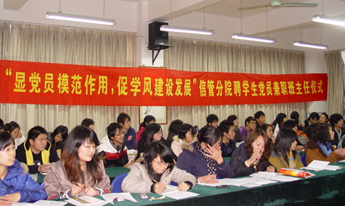 2009年12月14日下午,信息與管理分院在6-309隆重舉行了“顯黨員模范作用,促學風建設發(fā)展” 學生黨員兼職班主任聘任儀式。分院黨總支書記毛杰老師,分院各黨支部書記、支部委員、09班主任、團支書以及13名被聘任的黨建班主任參加了儀式。會議由分院黨總支組織委員盧曉慧老師主持。