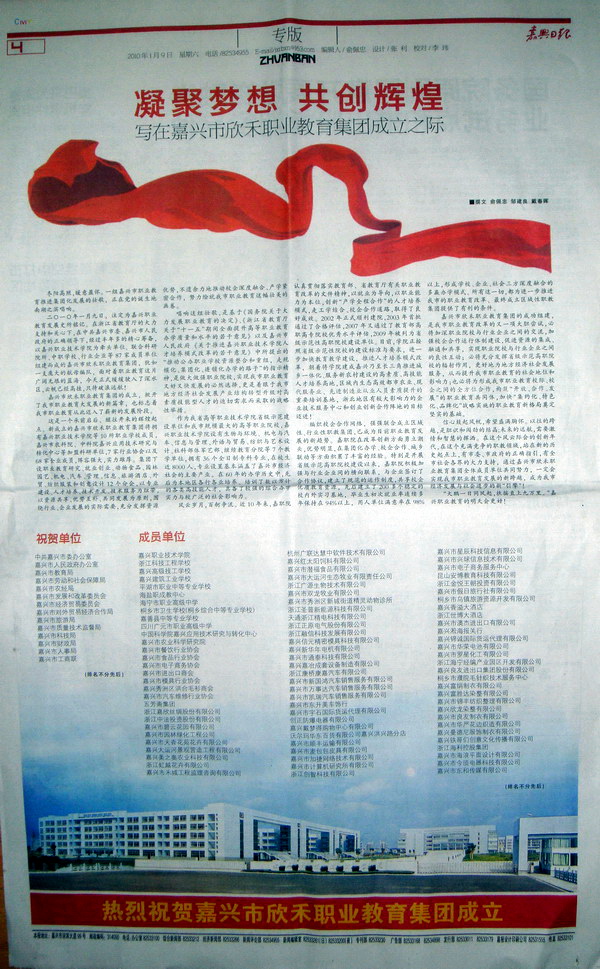 二〇一〇年一月九日,注定為嘉興職業(yè)教育發(fā)展史所銘記。在浙江省教育廳的大力支持和關(guān)心下,在中共嘉興市委、嘉興市人民政府的正確領(lǐng)導(dǎo)下,經(jīng)過半年多的精心籌備,以嘉興職業(yè)技術(shù)學(xué)院為牽頭單位,聯(lián)合科研院所、中職學(xué)校、行業(yè)企業(yè)等87家成員單位組建而成的嘉興市欣禾職業(yè)教育集團(tuán),猶如一支龐大的航母編隊(duì),面對(duì)著職業(yè)教育這片廣闊無垠的藍(lán)海,今天正式緩緩駛?cè)肓松钏畢^(qū),云帆已經(jīng)高掛,只待破浪遠(yuǎn)航!