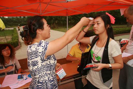 為了做好甲型H1N1流感防控工作,學(xué)院在報(bào)到現(xiàn)場設(shè)立了體溫測量點(diǎn),為報(bào)到的學(xué)生和家長檢測體溫。