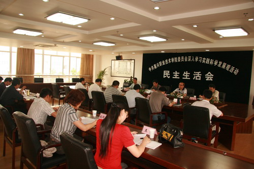 根據(jù)學(xué)院開展學(xué)習(xí)實踐科學(xué)發(fā)展觀活動的統(tǒng)一安排,6月8日下午,我院在行政樓208會議室召開了領(lǐng)導(dǎo)班子專題民主生活會。省委組織部干部三處副處長葉志航,市委學(xué)習(xí)實踐活動指導(dǎo)檢查組第七組組長張孝銘,市委教工委副書記、副局長趙阿發(fā)和市委組織部干部一處副處長劉玉成出席了會議。學(xué)院黨政領(lǐng)導(dǎo)班子成員以及教授、民主黨派、政協(xié)委員、中層干部、雙代會、青年教師代表等十余人參加了會議。會議由院黨委書記周奇跡同志主持。