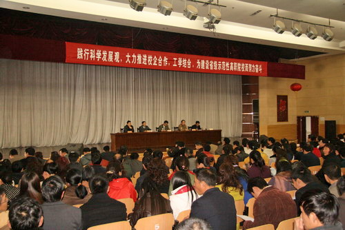 全教會上,院黨委書記周奇跡向全體教職員工作了《圍繞中心抓住重點(diǎn) 以更高的標(biāo)準(zhǔn)全面推進(jìn)學(xué)院科學(xué)和諧發(fā)展》的重要講話。他強(qiáng)調(diào)指出,2009年是建國60周年,也是我院建設(shè)省級示范的開局之年、二期工程的啟動(dòng)之年,任務(wù)重,要求高,學(xué)院要實(shí)現(xiàn)2009年新的工作目標(biāo),關(guān)鍵在于要建設(shè)一支思想過硬、業(yè)務(wù)精通、作風(fēng)優(yōu)良的教職員工隊(duì)伍,這是學(xué)院能夠科學(xué)和諧發(fā)展的重要前提和根本保證。他向全體教職員工提出了四點(diǎn)明確的希望與要求:一要以務(wù)求實(shí)效的要求開展深入學(xué)習(xí)實(shí)踐科學(xué)發(fā)展觀活動(dòng),不斷提升學(xué)院科學(xué)發(fā)展和執(zhí)政能力;二要以追求卓越的態(tài)度大力推進(jìn)示范建設(shè),不斷增強(qiáng)學(xué)院科學(xué)發(fā)展的核心競爭力;三要以百般的熱情全力做好畢業(yè)生就業(yè)工作,不斷提升學(xué)院科學(xué)發(fā)展的可持續(xù)能力;四要以改革創(chuàng)新的精神切實(shí)加強(qiáng)黨的建設(shè),為學(xué)院科學(xué)和諧發(fā)展提供堅(jiān)強(qiáng)的組織保障。最后,周書記號召全體教職員工在2009年牢固樹立科學(xué)發(fā)展觀,以更加昂揚(yáng)的斗志、更加振奮的精神、更加扎實(shí)的工作、更加輝煌的業(yè)績向建國60周年獻(xiàn)禮。
