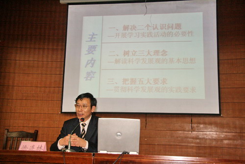徐連林副教授在報告中詳盡闡述了學(xué)習(xí)實踐科學(xué)發(fā)展觀的必要性,指出了要解決的理論認識問題和實踐認識問題;深入淺出地解讀了科學(xué)發(fā)展觀的豐富內(nèi)涵和精神實質(zhì),闡明要樹立全面協(xié)調(diào)可持續(xù)的發(fā)展觀、以人為本的價值觀和科學(xué)民主的執(zhí)政觀;系統(tǒng)講述了貫徹落實科學(xué)發(fā)展觀的實踐要求,強調(diào)實踐科學(xué)發(fā)展觀要有以人為本的思想理念、求真務(wù)實的領(lǐng)導(dǎo)作風(fēng)以及科學(xué)合理的制度環(huán)境。