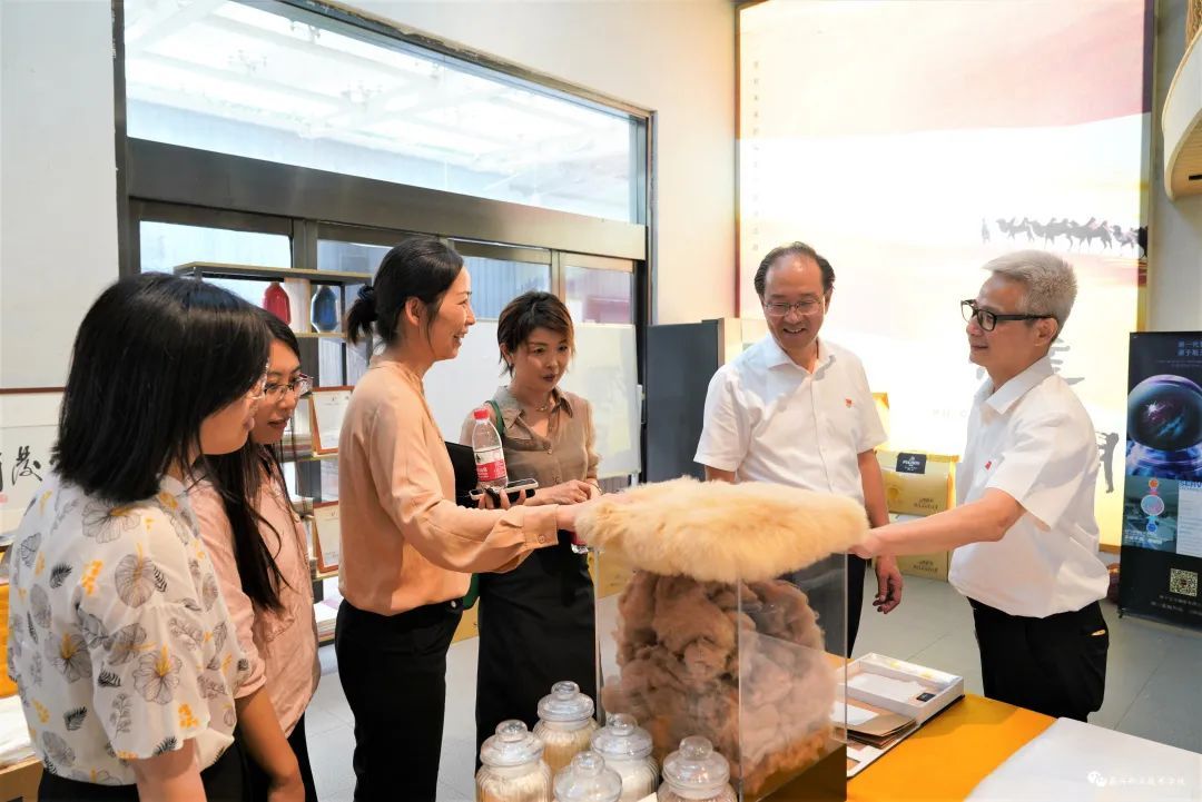方俊良一行在戴金海陪同下參觀“水鏡軒”展廳,聽取產(chǎn)品介紹。有別于傳統(tǒng)的手工縫紉和印染技藝,公司將莫奈、畢加索等世界文化元素,紅船、烏鎮(zhèn)等江南傳統(tǒng)文化元素融入真絲圍巾和服飾,還將科技元素融入產(chǎn)品中,通過加裝智能芯片,讓圍巾散發(fā)熱量,并在手機(jī)APP上進(jìn)行溫度調(diào)節(jié)、開關(guān)等操作,實(shí)現(xiàn)了傳統(tǒng)服飾企業(yè)向文創(chuàng)企業(yè)的新跨越。