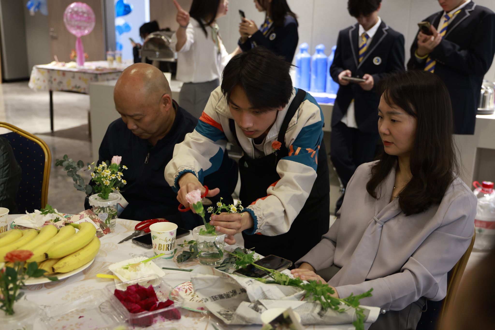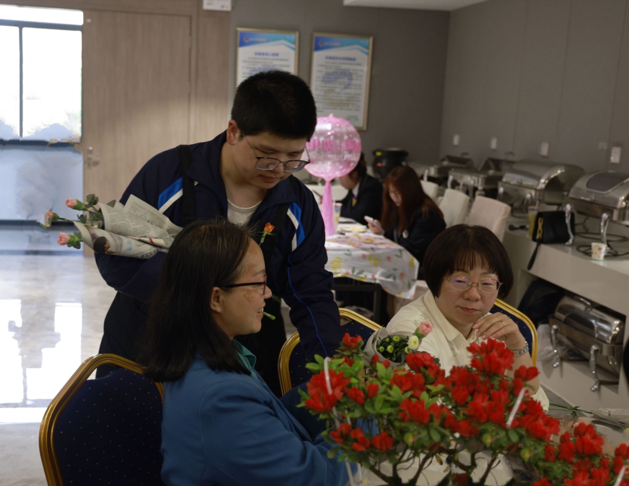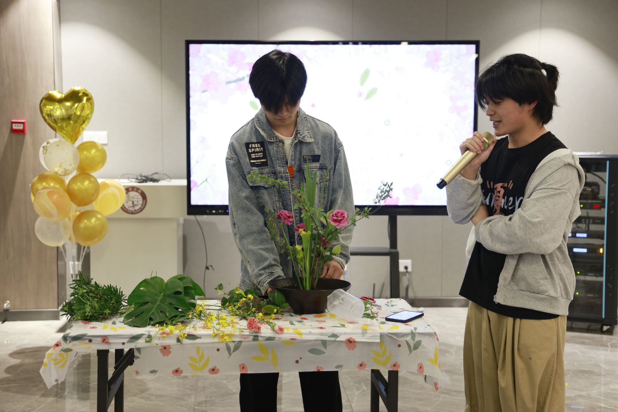 本次活動(dòng),學(xué)校工會(huì)充分運(yùn)用高品質(zhì)、高顏值、高內(nèi)涵的智慧酒店綜合實(shí)訓(xùn)中心,結(jié)合現(xiàn)代農(nóng)業(yè)學(xué)院專(zhuān)業(yè)特色和資源,為教職工們打造視覺(jué)、聽(tīng)覺(jué)、味覺(jué)三重享受。園藝專(zhuān)業(yè)學(xué)生帶來(lái)美輪美奐的花藝表演,學(xué)院穗禾之音合唱團(tuán)為教師們獻(xiàn)上《裹著心的光》《海芋戀》兩首生日祝歌,工會(huì)特意為每位壽星準(zhǔn)備了杜鵑花盆栽和DIY杯花作為生日禮物,并附上學(xué)生親筆書(shū)寫(xiě)的生日賀卡,現(xiàn)場(chǎng)五彩繽紛、花香縈繞,老師們紛紛動(dòng)手制作個(gè)人風(fēng)格的杯花作品,園林技術(shù)專(zhuān)業(yè)學(xué)生做杜鵑花盆栽養(yǎng)護(hù)知識(shí)科普,風(fēng)景園林社社志愿者則擔(dān)當(dāng)杯花制作技術(shù)指導(dǎo),師生互動(dòng)、其樂(lè)融融。