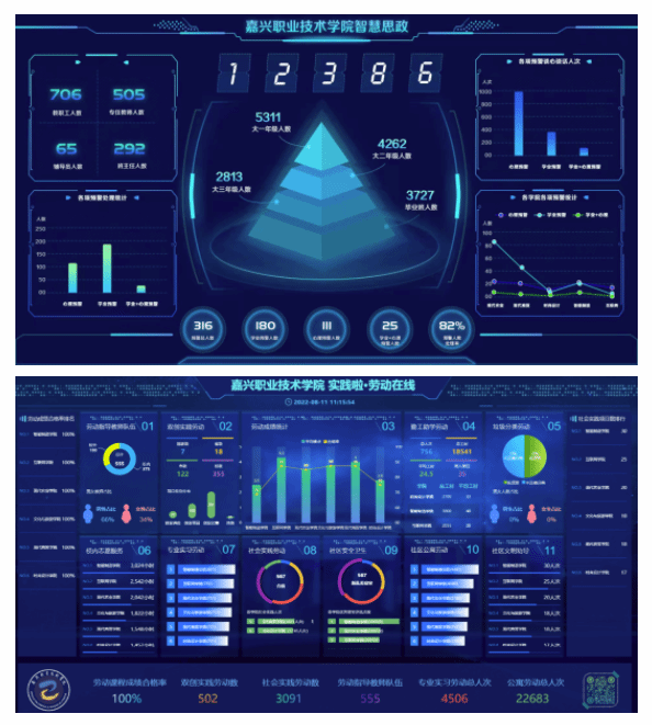 學(xué)校持續(xù)推動勞動教育與現(xiàn)代信息技術(shù)高度融合,開發(fā)“實(shí)踐啦·勞動在線”評價系統(tǒng),打造勞動教育“融課堂”。系統(tǒng)建有治理端、服務(wù)端,建成主題駕駛艙,全面展現(xiàn)勞動教育開展情況,用V字模型法拆解核心任務(wù),設(shè)計(jì)了勞動教育課程、社區(qū)衛(wèi)生、勤工助學(xué)、“雙創(chuàng)”實(shí)踐勞動等7個應(yīng)用場景,對應(yīng)課程優(yōu)秀率、雙創(chuàng)獲獎率、實(shí)踐參與率等7個指標(biāo)體系,涵蓋項(xiàng)目發(fā)布、學(xué)生申請等24個流程任務(wù)點(diǎn),對接教務(wù)、學(xué)工、人臉庫、志愿匯等五大數(shù)源系統(tǒng),集成項(xiàng)目、成績、積分等近28個大類數(shù)據(jù),為日常管理和分析決策提供數(shù)據(jù)支撐,形成學(xué)校勞動教育整體畫像及學(xué)生個人成長畫像。