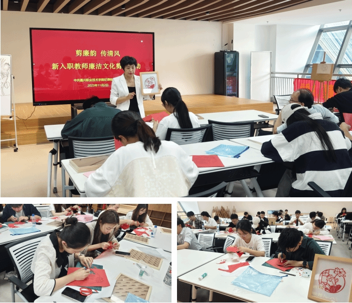 讀書(shū)會(huì)后,新教師們移步五樓手工教室,嘉興非遺剪紙傳承人羅瑤老師現(xiàn)場(chǎng)教授了“廉潔剪紙”技巧。新教師們用一幅幅栩栩如生的剪紙作品,描繪自己的廉潔從教理想,扣牢廉潔紐扣。