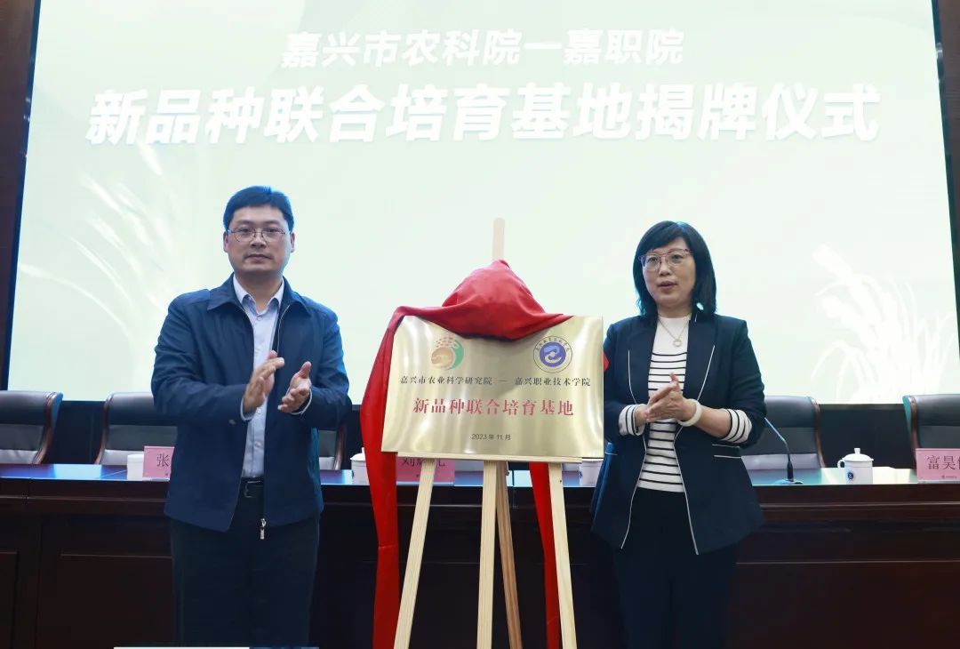 嘉職院院長(zhǎng)張紅、嘉興市農(nóng)業(yè)科學(xué)研究院副院長(zhǎng)王暉共同為聯(lián)合育種試驗(yàn)基地揭牌。