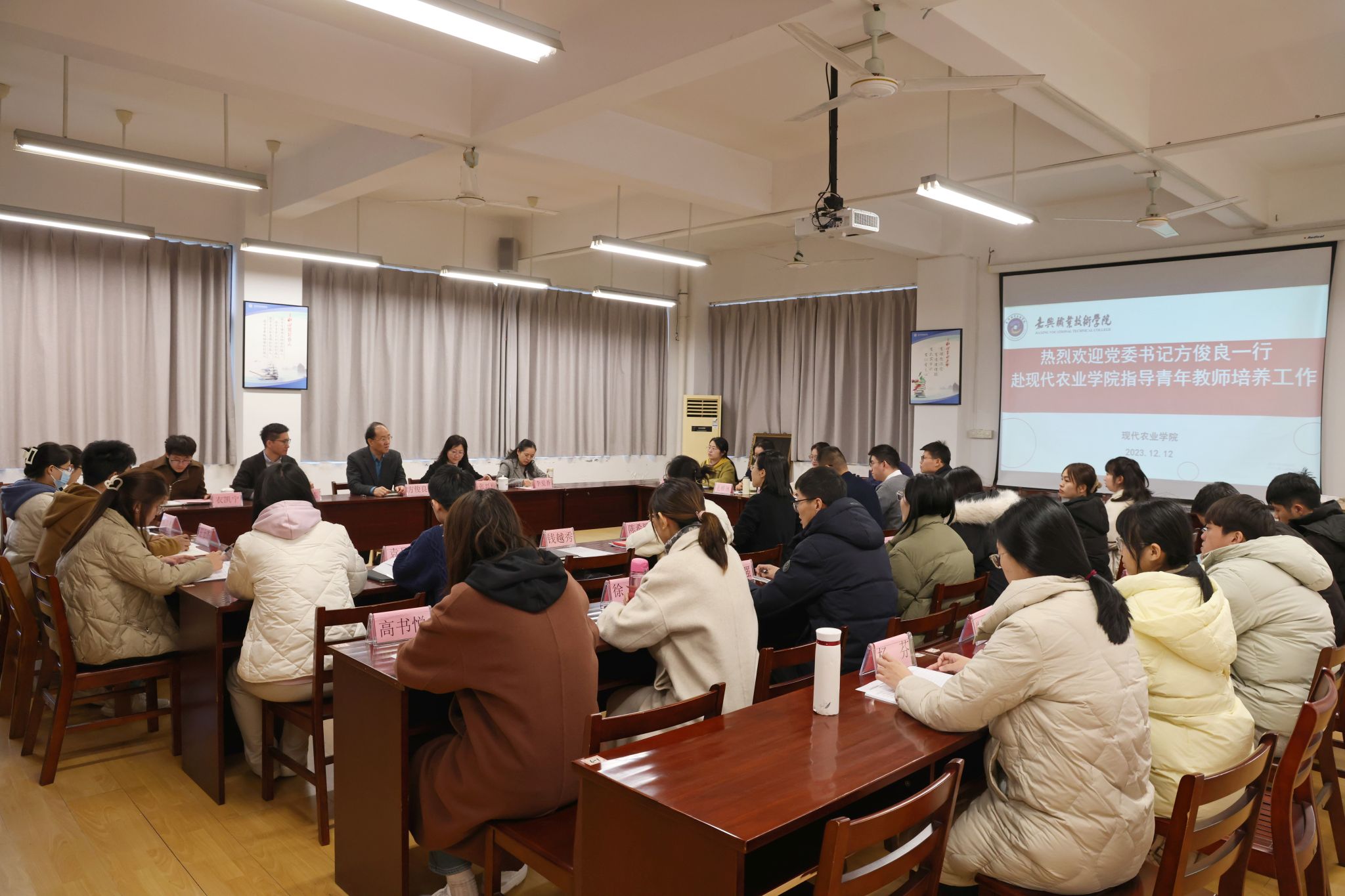 12月12日,校黨委書記方俊良蒞臨現(xiàn)代農業(yè)學院,就新教師培養(yǎng)及職業(yè)發(fā)展路徑、“雙師型”素質教師培育培養(yǎng)等情況進行調研指導,與28名新教師進行深入交流。