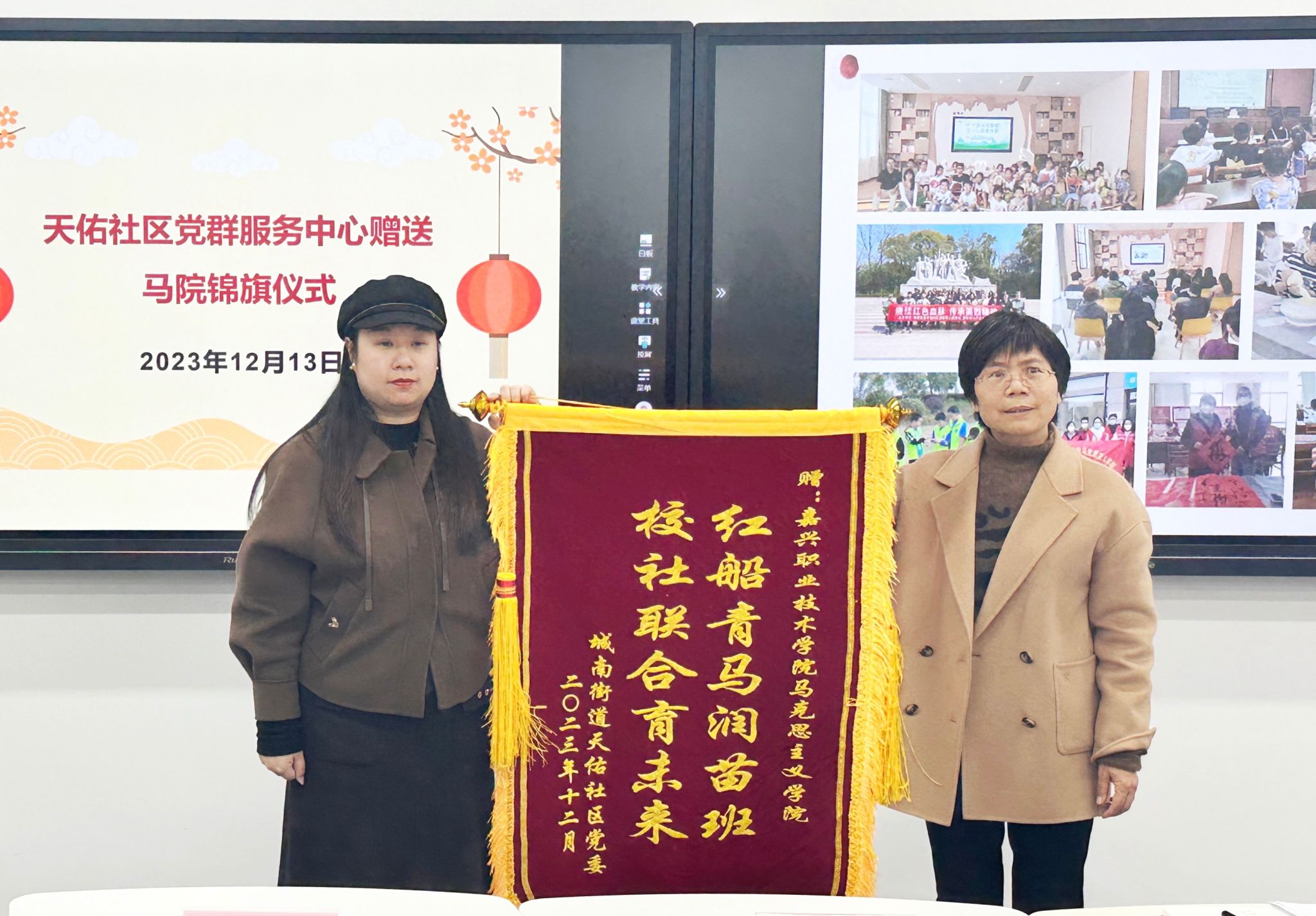12月13日下午,天佑社區(qū)黨群服務(wù)中心黨委副書記陳婕一行來(lái)到嘉職院馬克思主義學(xué)院,為學(xué)院贈(zèng)送“紅船青馬潤(rùn)苗班,校社聯(lián)合育未來(lái)”錦旗一面,表達(dá)對(duì)學(xué)院開(kāi)設(shè)“紅船青馬潤(rùn)苗班”,協(xié)同天佑社區(qū)共育青少年的感激之情。