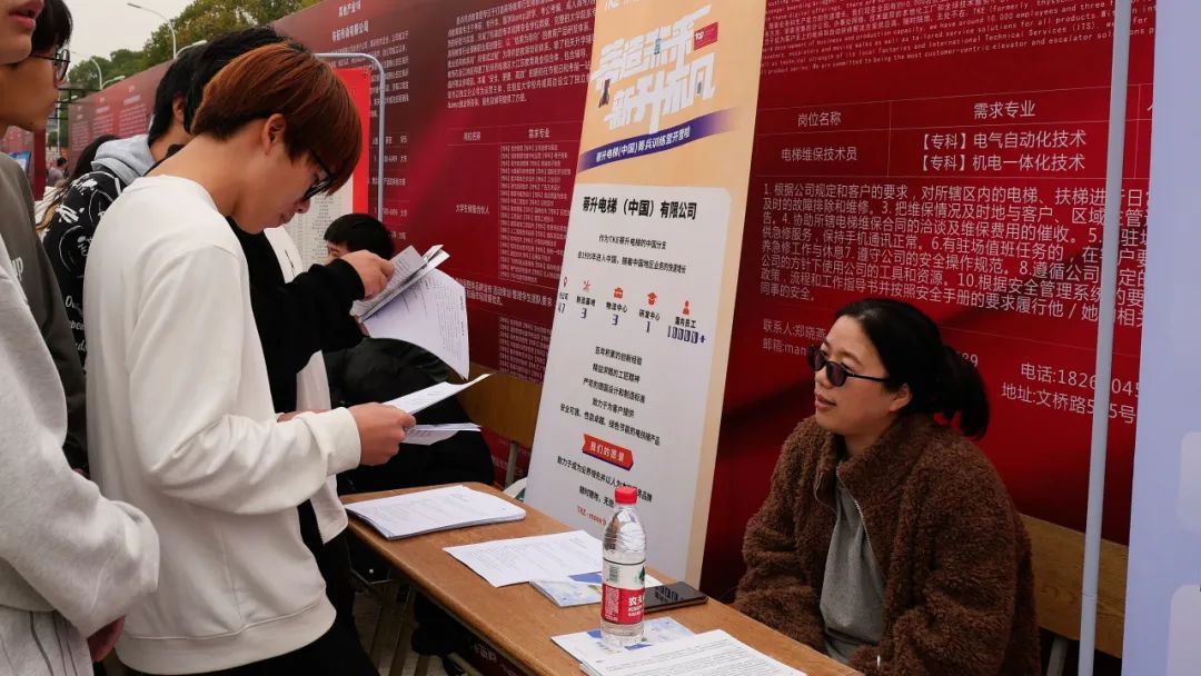 在企業(yè)布展招聘專區(qū),學(xué)生們且走且看,不時上前詢問,“物色”適合自己的工作崗位。不少招聘負責(zé)人也在展臺前盡情“吆喝”,全力展示企業(yè)的特色優(yōu)勢,希望吸引更多優(yōu)秀人才前來應(yīng)聘。