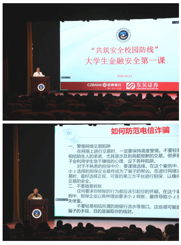 互聯(lián)網(wǎng)學(xué)院、網(wǎng)絡(luò)空間安全學(xué)院邀請(qǐng)東吳證券、浙商銀行嘉興分行經(jīng)理為新生帶來財(cái)務(wù)安全講座。主講人講解了校園貸、個(gè)人征信管理、個(gè)人信息保護(hù)等方面的知識(shí)。通過生動(dòng)的案例分析和實(shí)用的防范技巧,新生們對(duì)財(cái)務(wù)安全的重要性有了更加全面和深入的了解。