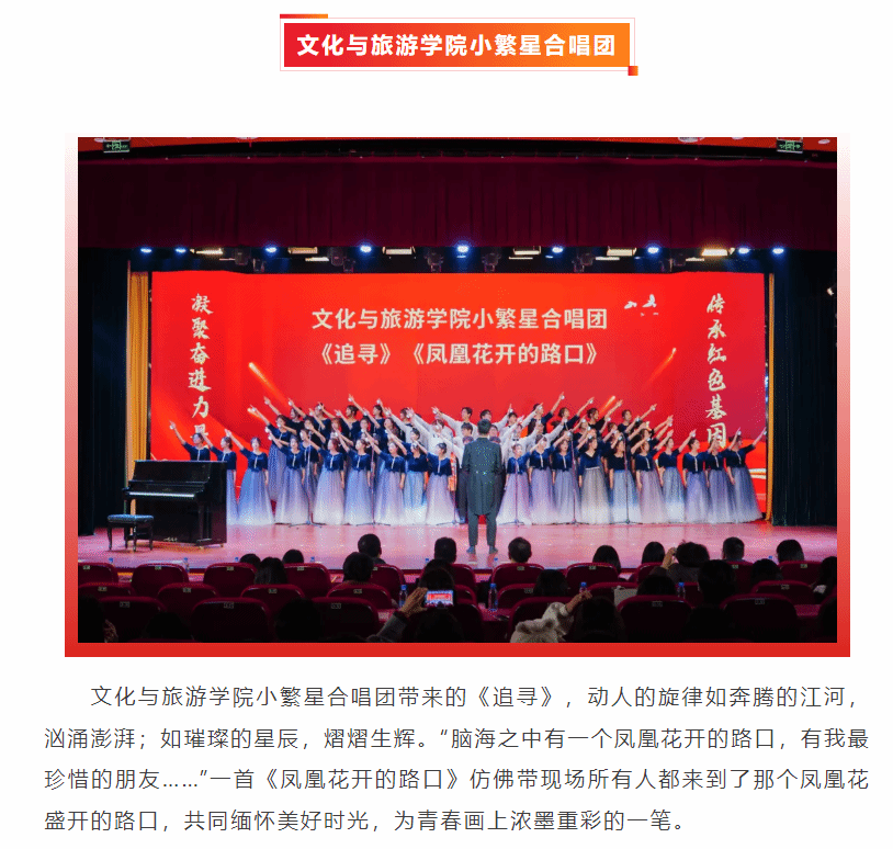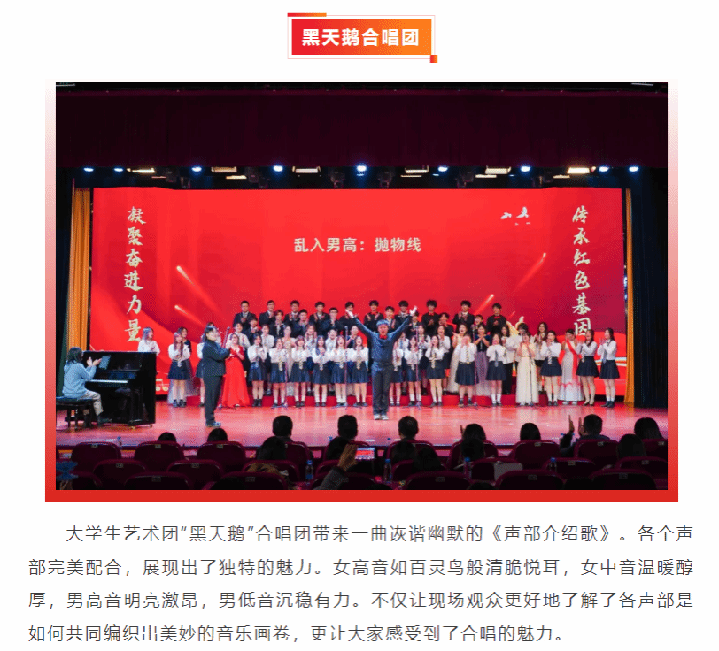 近日,嘉職院舉行第三屆大學(xué)生合唱文化節(jié)暨第十二屆紀(jì)念一二?九愛國運(yùn)動(dòng)合唱比賽。學(xué)校大學(xué)生藝術(shù)團(tuán)“黑天鵝”合唱團(tuán)和來自各二級(jí)學(xué)院的大學(xué)生合唱團(tuán)以青春之聲謳歌黨的豐功偉績,唱出了對(duì)祖國美好河山的贊美和熱愛,展現(xiàn)出新時(shí)代青年的精神風(fēng)貌。