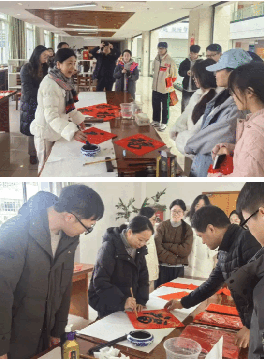 12月26日至27日,“翰墨舞巳蛇” 送 “?!?活動準時啟幕,書法愛好者們齊聚一堂,揮毫潑墨。中國書法家協(xié)會會員、嘉興市文化館黨支部書記、館長褚曉瓊等嘉賓親臨現(xiàn)場寫“?!彼汀案!?,飽含濃濃年味、寓意吉祥的200幅春聯(lián)與460個福字躍然紙上,每一個都承載著新春的祥瑞和對師生們滿滿的祝福。活動還吸引了留學生們前來參加體驗。