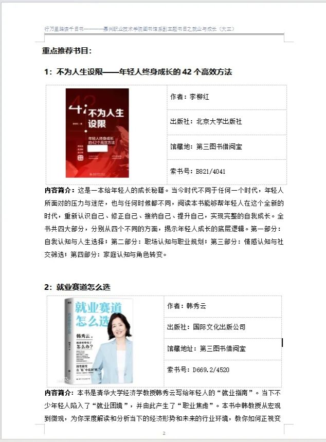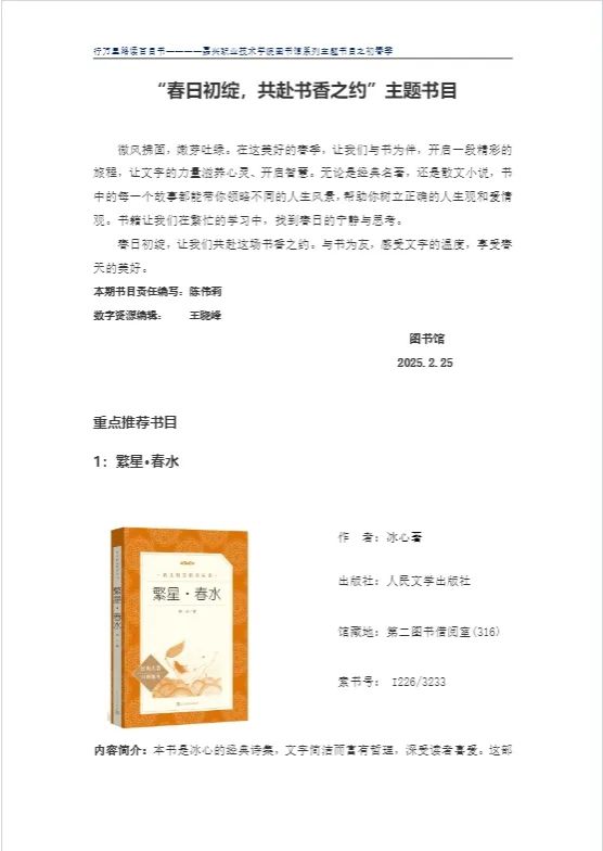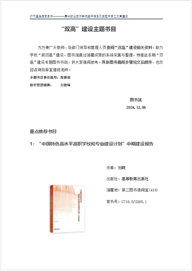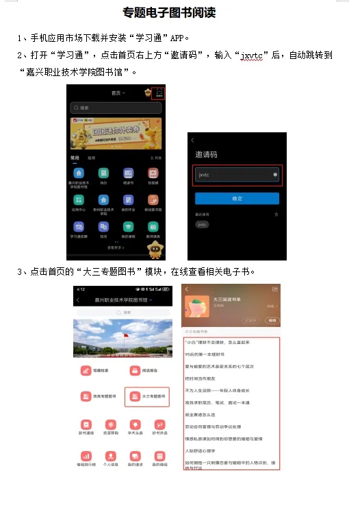 圖書(shū)館已陸續(xù)推出了雙高專題、大一職業(yè)規(guī)劃專題、大三就業(yè)專題、春日專題、剪紙專題、經(jīng)典文學(xué)專題等6個(gè)專題,通過(guò)釘釘教職工群及閱讀助理群推送,同時(shí)請(qǐng)超星公司配合在學(xué)習(xí)通上推出各專題的電子圖書(shū),可在線閱讀。