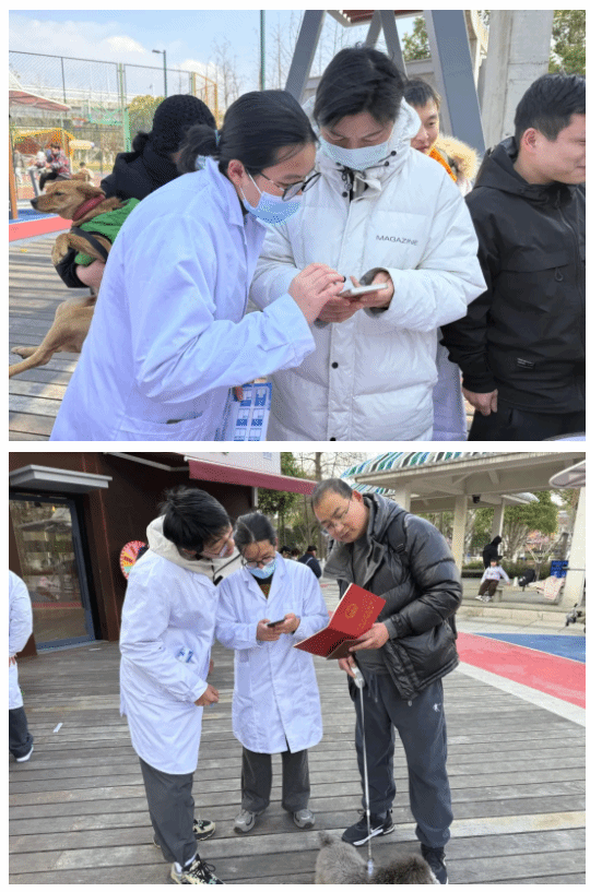 身穿白大褂的“小青芒”志愿者也成為一道亮眼的風景線。他們分工協(xié)作,有的引導(dǎo)居民填寫犬證辦理材料,有的發(fā)放《文明養(yǎng)犬手冊》,有的為寵物主人講解科學喂養(yǎng)知識?!昂芏嗑用駥︷B(yǎng)犬法規(guī)了解不全面,我們通過案例講解,幫助他們理解遛狗牽繩、定期免疫的重要性?!薄靶∏嗝ⅰ敝驹刚邉⒂f。居民陳阿姨帶著愛犬完成了疫苗注射和辦證流程,她感慨道:“平時工作忙,一直沒時間帶狗狗打疫苗,這次活動既省心又放心,非常感謝老師和學生們的服務(wù)!”