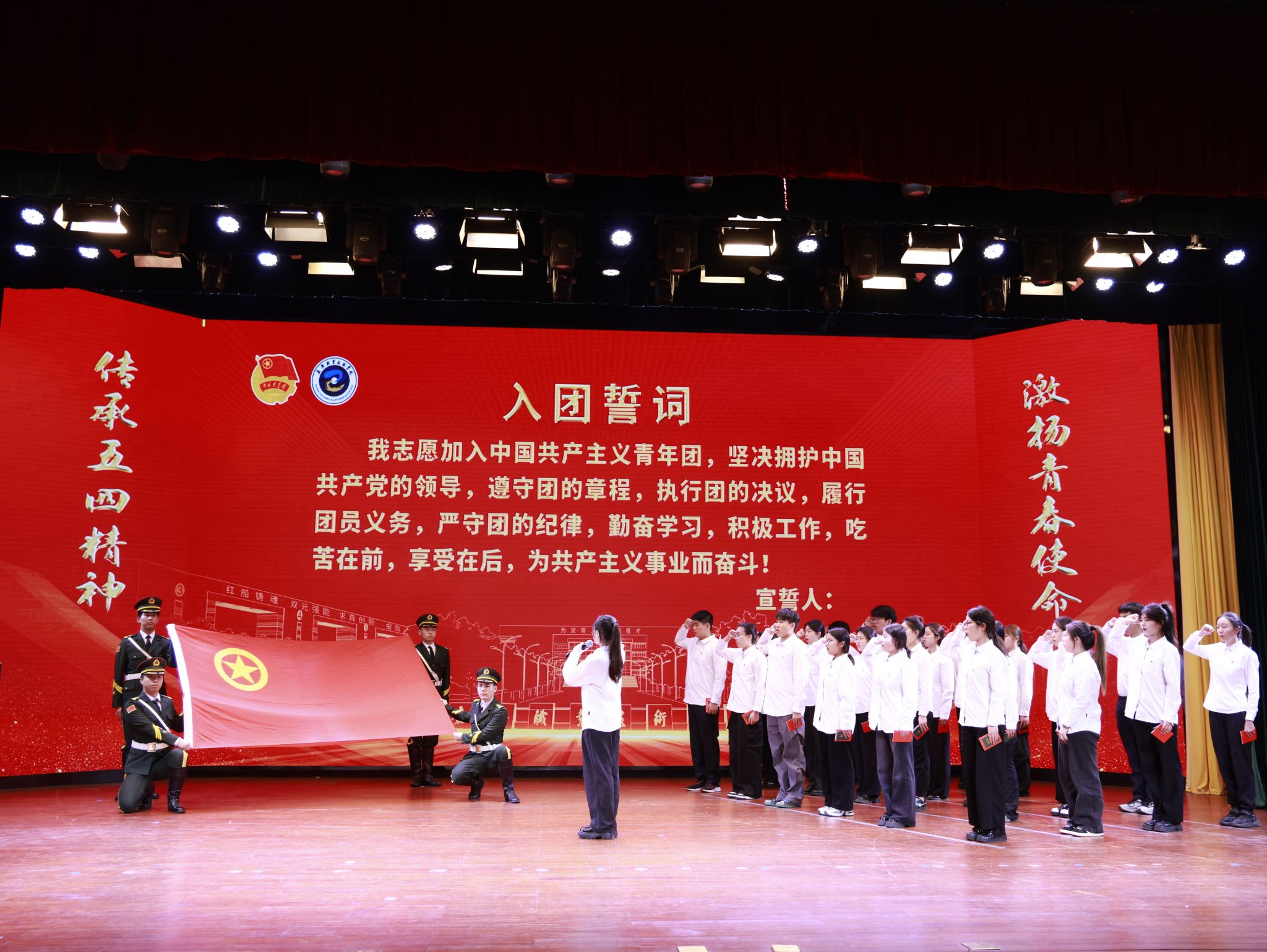 入團(tuán)儀式上,24名新發(fā)展團(tuán)員代表上臺,各學(xué)院團(tuán)總支書記為他們頒發(fā)團(tuán)徽、團(tuán)員證和團(tuán)章。隨后,全體新發(fā)展團(tuán)員們在團(tuán)旗下莊嚴(yán)宣誓。
