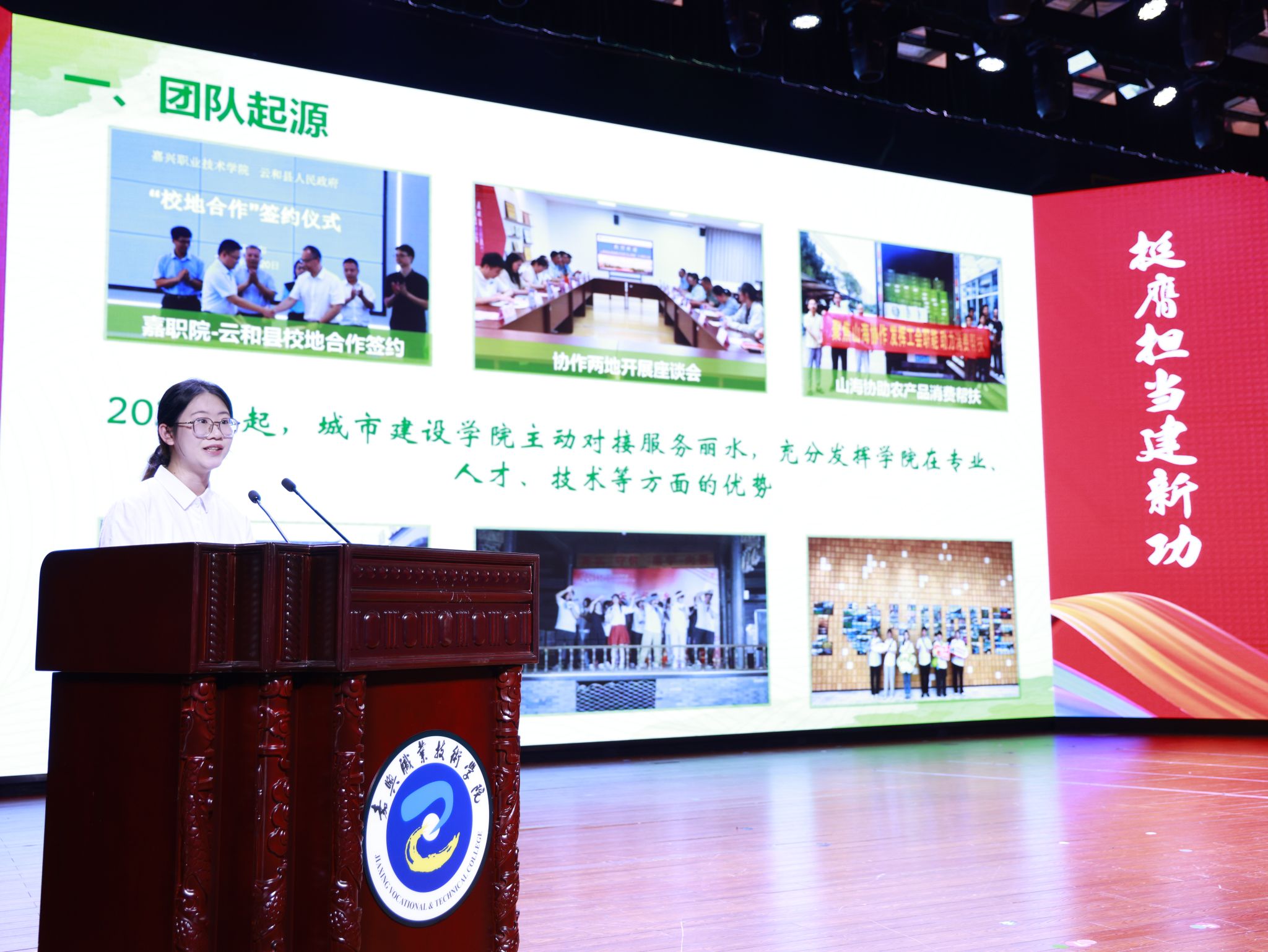 出征儀式上,浙江省高校暑期社會實踐優(yōu)秀調研成果交流展示活動金獎團隊、城市建設學院優(yōu)秀實踐團隊“山呼海應 古村新生——‘鄉(xiāng)村共創(chuàng)’”實踐團進行成果展示和交流分享。
