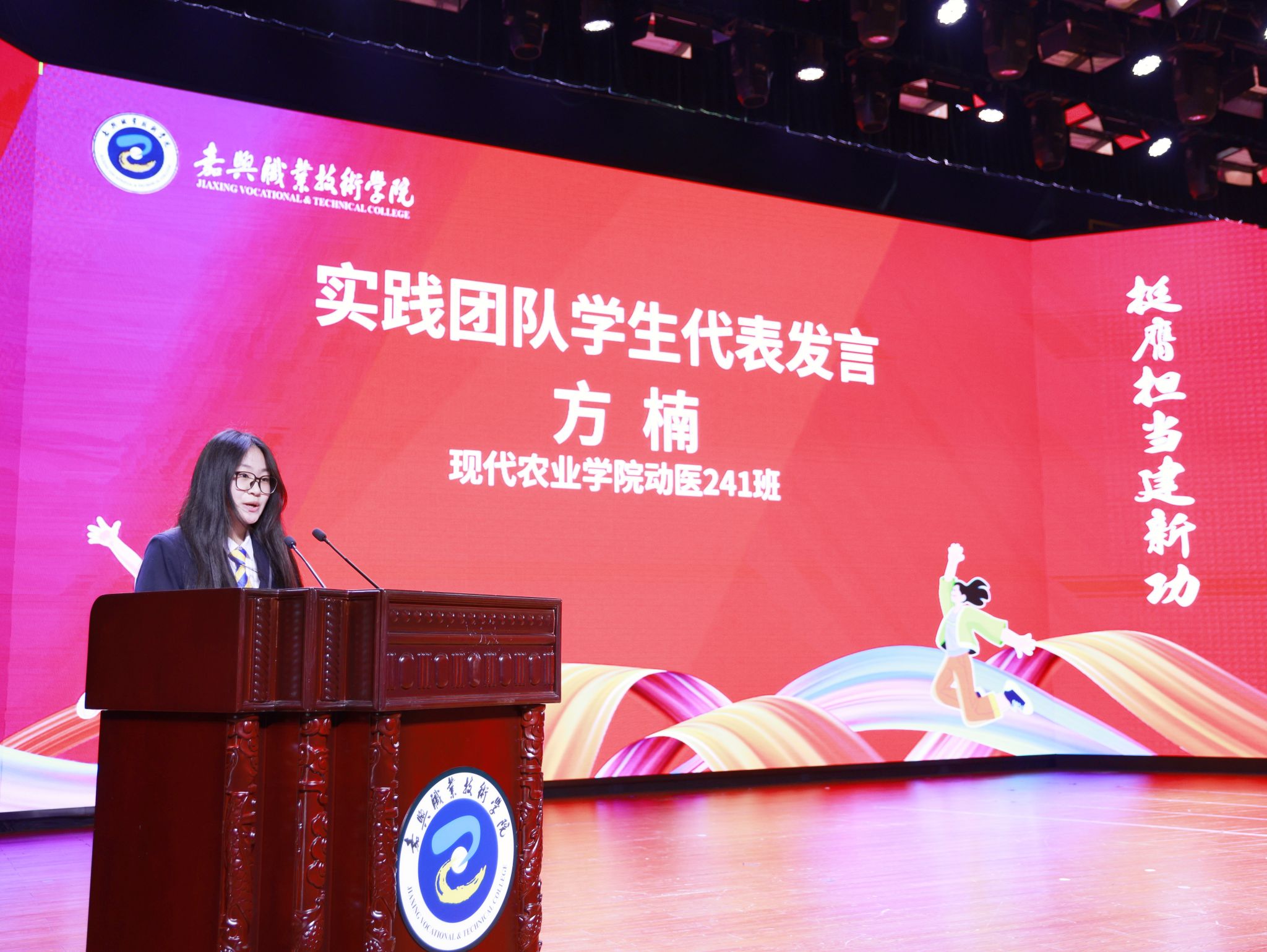 “作為新時代嘉職青年,我們必將以‘求知若渴’的執(zhí)著,在實踐中探索真理,帶著問題意識深入基層,在解決實際問題中增長才干;以‘精益求精’的態(tài)度,在服務中錘煉本領,把每一件小事都做到最好,在平凡中見偉大;以‘眾志成城’的信念,在團隊中凝聚力量,互幫互助,共同進步,展現嘉職學子的團隊精神。”學生代表、動醫(yī)241班方楠說。