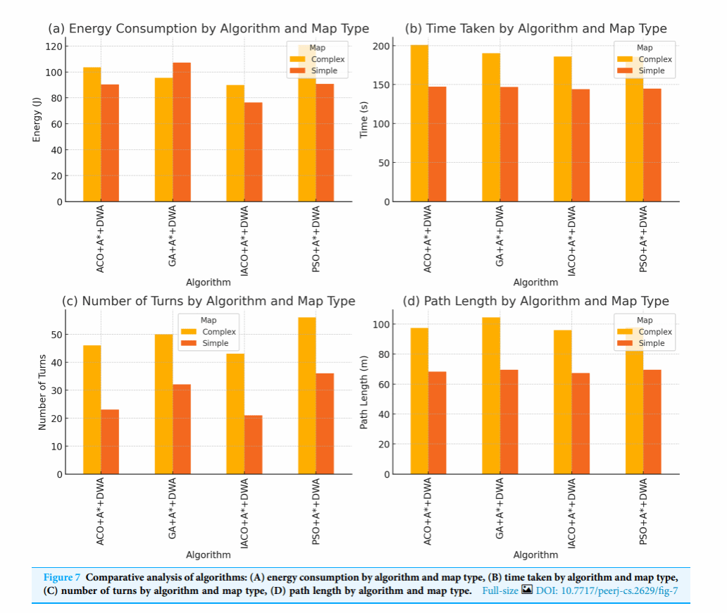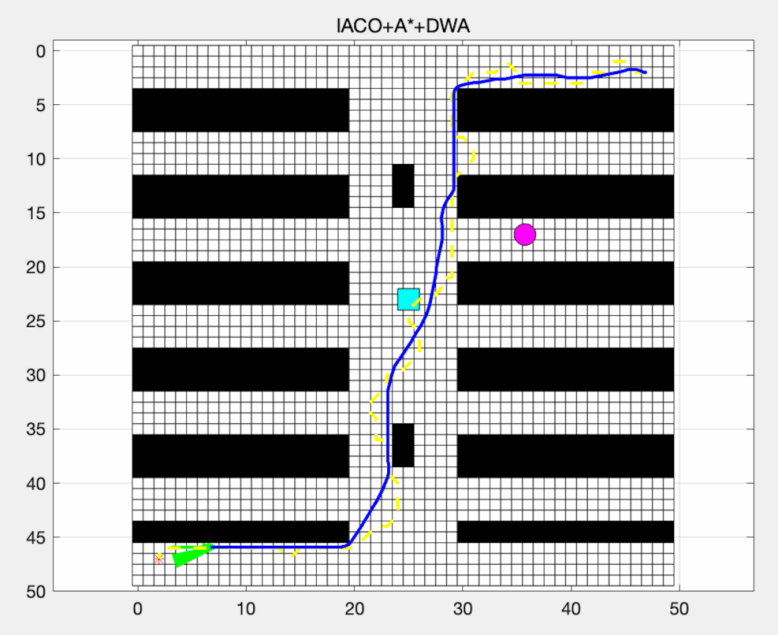 該系列學(xué)術(shù)成果在人工智能+機器人與人工智能+健康兩大領(lǐng)域取得了實質(zhì)性突破。在機器人方向,研究提出了一種多層混合路徑規(guī)劃框架:首先利用A*算法生成全局可行解;隨后在群體智能層引入差分變異與信息素重置機制的改進蟻群優(yōu)化算法,對全局路徑進行優(yōu)化;最后在局部動態(tài)層結(jié)合動態(tài)窗口法(DWA),實現(xiàn)復(fù)雜動態(tài)環(huán)境下的實時避障與速度控制。通過在倉儲環(huán)境仿真平臺上的對比實驗,該方法在能耗降低、路徑長度縮短和任務(wù)執(zhí)行時間等指標上均顯著優(yōu)于傳統(tǒng)ACO、PSO與GWO等算法,平均能耗下降超過 12%,執(zhí)行時間縮短 8%,并在多任務(wù)調(diào)度與動態(tài)避障中表現(xiàn)出更高的穩(wěn)定性,為智能物流和倉儲機器人節(jié)能調(diào)度提供了切實可行的解決方案。