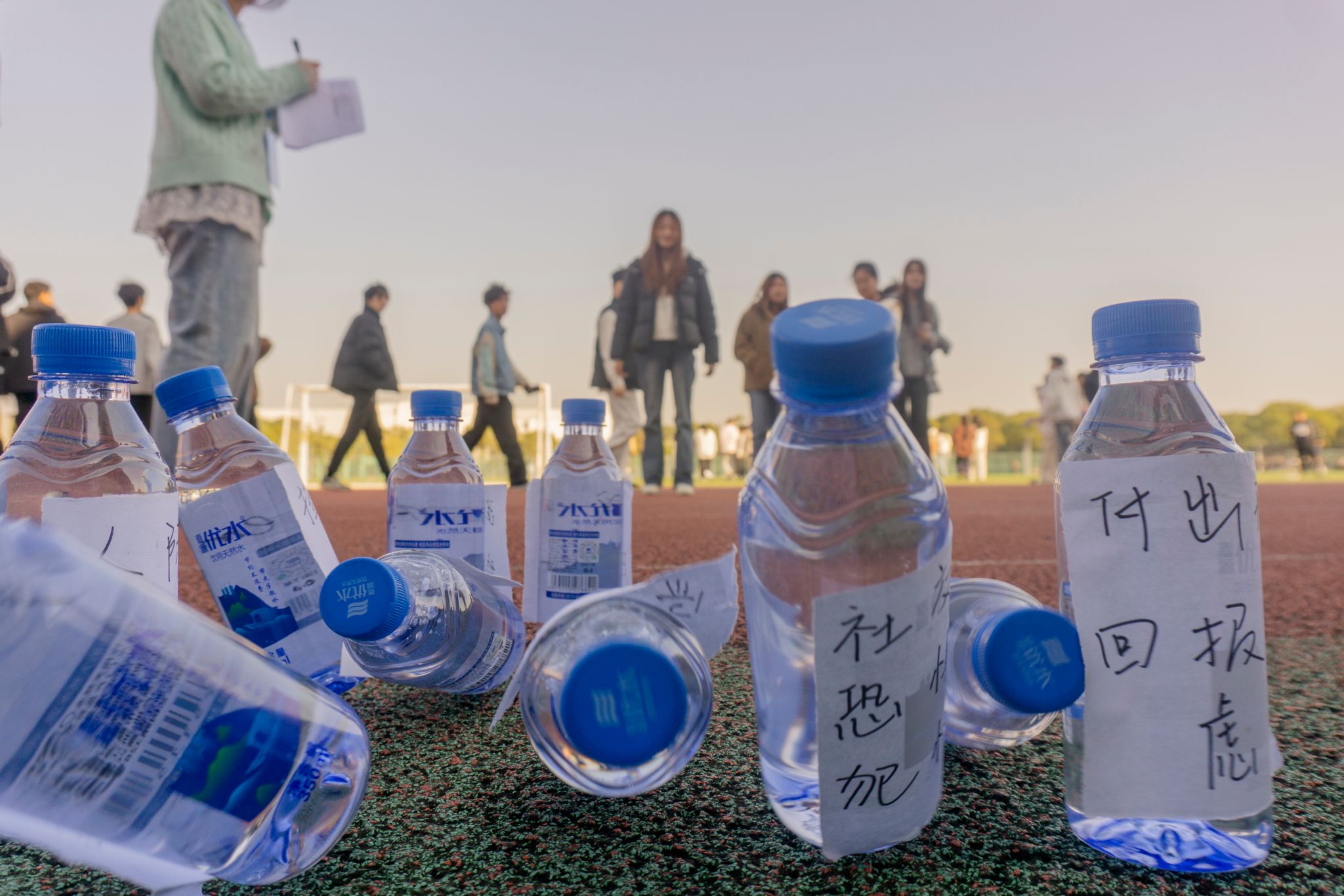 “加油!把‘越卷越迷?!瘬舻?!” 青春無負(fù) “擊” 活動(dòng)區(qū)吶喊聲不斷。礦泉水瓶做成的 “保齡球” 上,貼著 “考試失利”“社交焦慮” 等負(fù)面情緒標(biāo)簽,在陽光下排成整齊的隊(duì)列。同學(xué)們手持足球,凝神瞄準(zhǔn)、奮力滾動(dòng),看著瓶子一個(gè)個(gè)應(yīng)聲倒地,臉上都露出了暢快的笑容。賽道上的每一次撞擊,都像是在陽光下?lián)羲榻箲],讓輕松與自信悄悄萌芽。