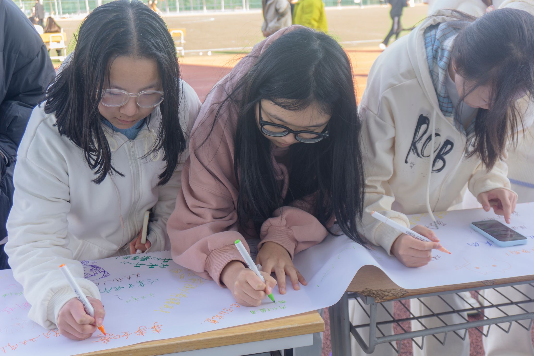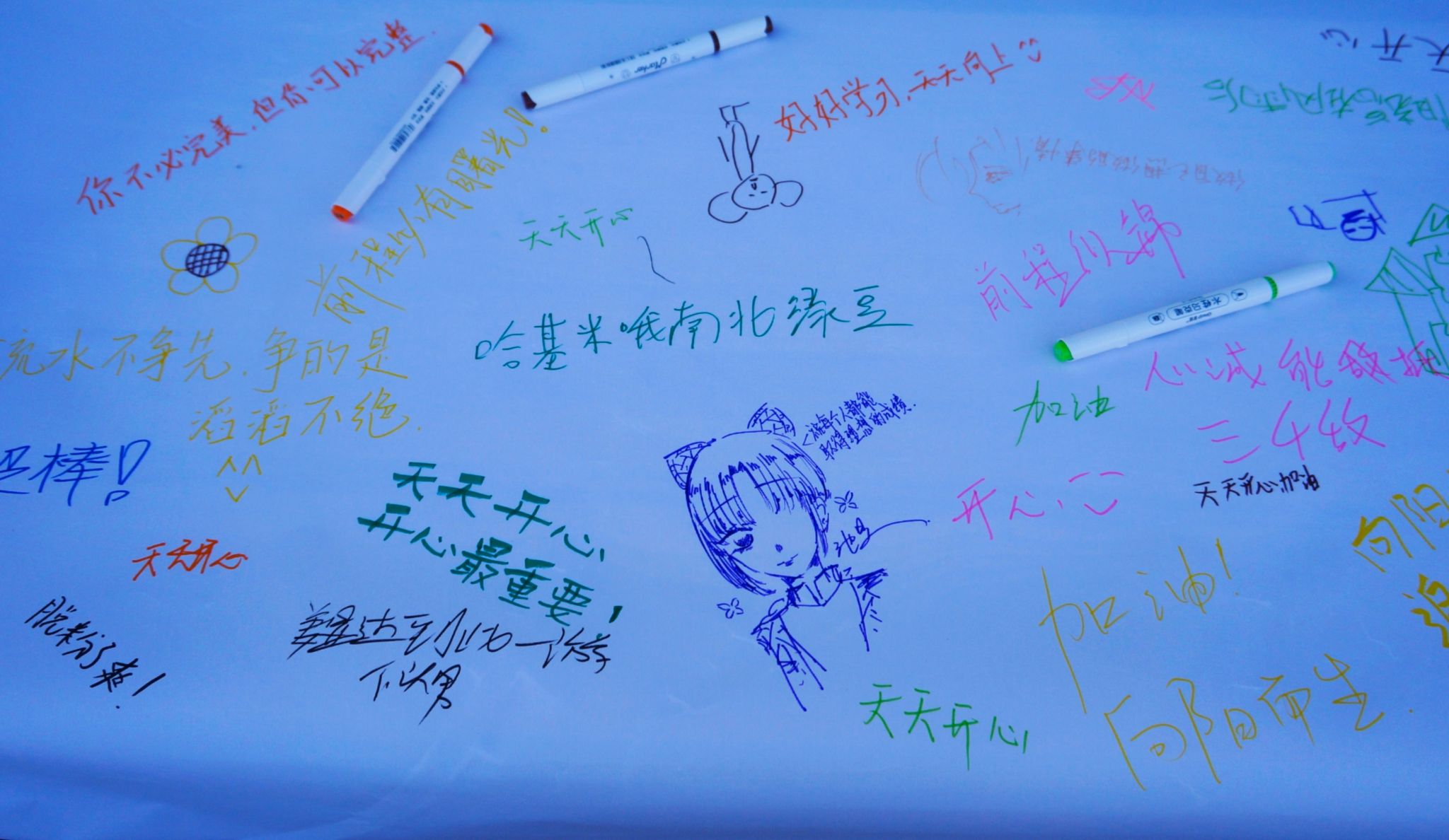 “心情涂鴉墻” 前排起了長隊(duì),大幅空白畫布在陽光下泛著光澤。同學(xué)們手持多彩馬克筆,有的畫下咧嘴笑的太陽、跳躍的彩虹,用明亮的黃、溫暖的橙勾勒出愉悅的心情;有的寫下 “今天超棒”“接納不完美” 等短句,用樸實(shí)的文字傾訴心聲。沒有規(guī)則的束縛、沒有評(píng)判的壓力,大家你一筆我一畫,原本空白的畫布漸漸變成斑斕的 “情緒光譜”?;顒?dòng)結(jié)束后,這幅承載著集體心意的作品被掛起,傳遞著 “每一種情緒都值得被溫柔接納” 的暖意。