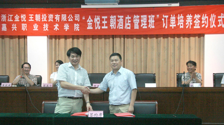 6月30日下午,我院與浙江金悅王朝投資有限公司再度簽訂了酒店管理班人才培養(yǎng)協(xié)議。學(xué)院黨委副書記、副院長(zhǎng)周建新、浙江金悅王朝投資有限公司董事長(zhǎng)盛富林、學(xué)院科技與產(chǎn)學(xué)合作處處長(zhǎng)黃雪峰、外語(yǔ)與貿(mào)易分院黨總支書記、副院長(zhǎng)姚寧屏、外語(yǔ)與貿(mào)易分院副院長(zhǎng)王家慶及訂單班26位同學(xué)出席了簽約儀式。