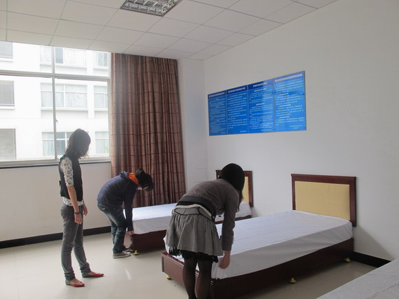 寬敞、明亮、整潔的環(huán)境將會是這個實訓(xùn)基地給人的第一印象,“客房”實訓(xùn)基地的設(shè)立,為酒店管理的學(xué)生再次提供了一個學(xué)以致用的地方,在這里,教師可以向?qū)W生授課,傳播理論知識的同時,要求學(xué)生快速地把課本上的知識轉(zhuǎn)化成實際操作中的技能,這里是學(xué)生的第二課堂,良好的環(huán)境、標(biāo)準(zhǔn)化的客房,能夠極大限度地激發(fā)起學(xué)生學(xué)習(xí)的興趣,他們非常樂意參與其中,在教師的指導(dǎo)下完成鋪床、疊被子、整理房間等實訓(xùn)任務(wù),在潛移默化中完成對知識的吸收,大大提高了教學(xué)效率。模擬客房操作室目前還在不斷完善中,努力向“一體化教室”邁進(jìn)。