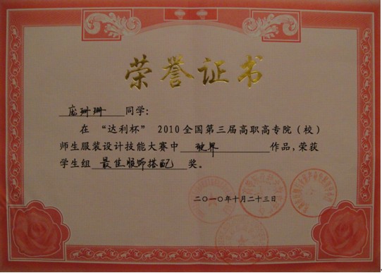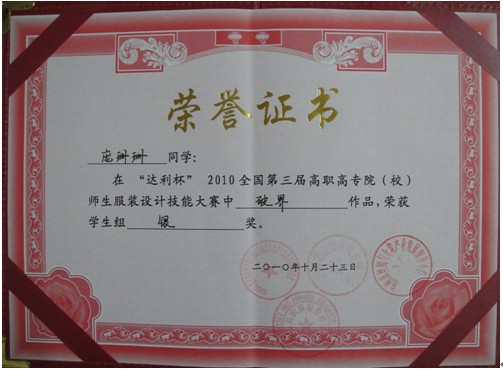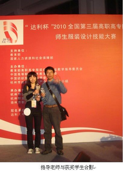10月23日晚,“2010全國(guó)第三屆高職高專院(校)師生服裝設(shè)計(jì)技能大賽”在中國(guó)達(dá)利制衣有限公司時(shí)裝表演廳舉行總決賽,經(jīng)過(guò)緊張激烈的角逐,我院紡藝分院服裝081班龐姍姍同學(xué)的作品《破界》殺出重圍,喜獲“達(dá)利杯”全國(guó)服裝設(shè)計(jì)大賽學(xué)生組銀獎(jiǎng)和最佳服飾搭配獎(jiǎng)。