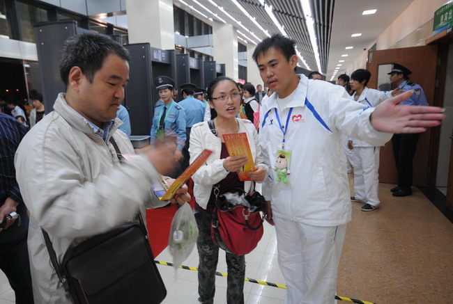 開幕式現(xiàn)場,學生志愿者為觀眾進行引導服務(wù)